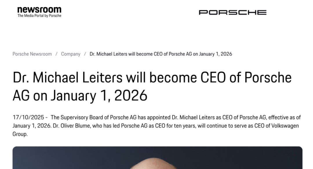 保時(shí)捷一則人事公告為持續(xù)數(shù)月的“CEO更迭傳聞”畫(huà)上句號(hào)。保時(shí)捷官方宣布:現(xiàn)任首席執(zhí)行官奧博穆(Oliver Blume)將于2025年年底卸任,自2026年1月1日起,由邁克爾·萊特斯(Michael Leiters)接棒,成為新掌舵人。